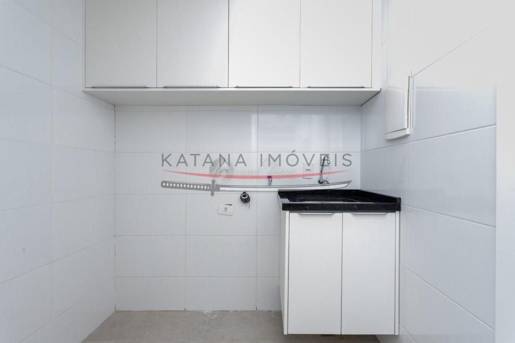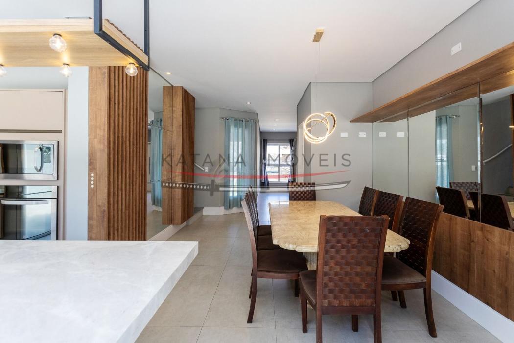 Sala de jantar integrada com a cozinha totalmente mobiliada. Cozinha e lavanderia com móveis planejados.