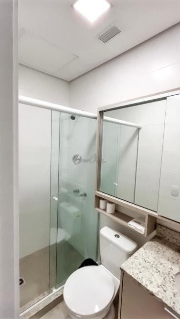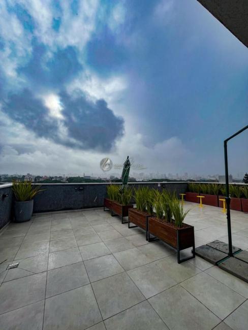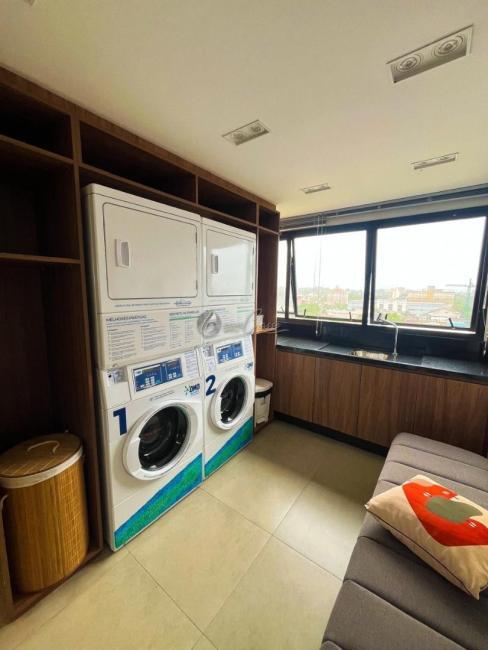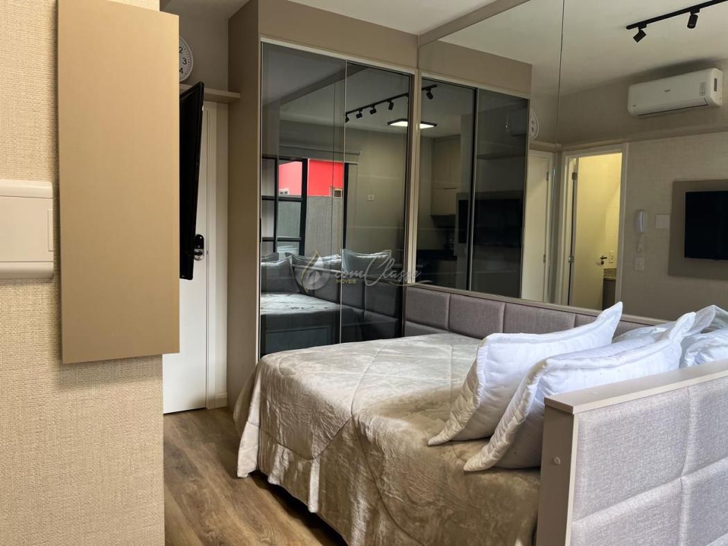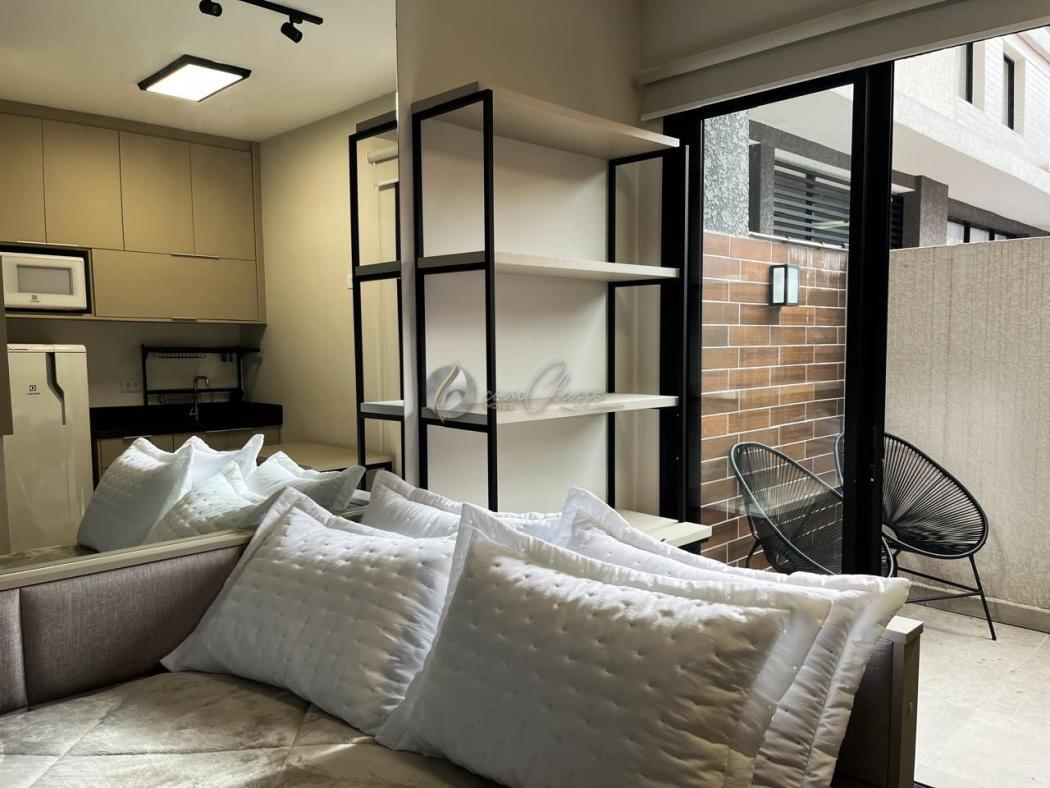 O imóvel de 25m² privativos mobiliado, conta com: cozinha planejada equipada com geladeira, cooktop de indução e micro-ondas; Mesa para refeições; quarto com cama baú de casal; TV e armários embutidos, além de ar condicionado e varanda.