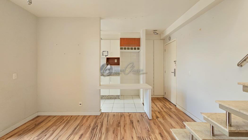 Apartamento com dois pavimentos, sendo o inferior apartamento tipo e o superior ático com terraço, lavabo e área de serviço coberta.