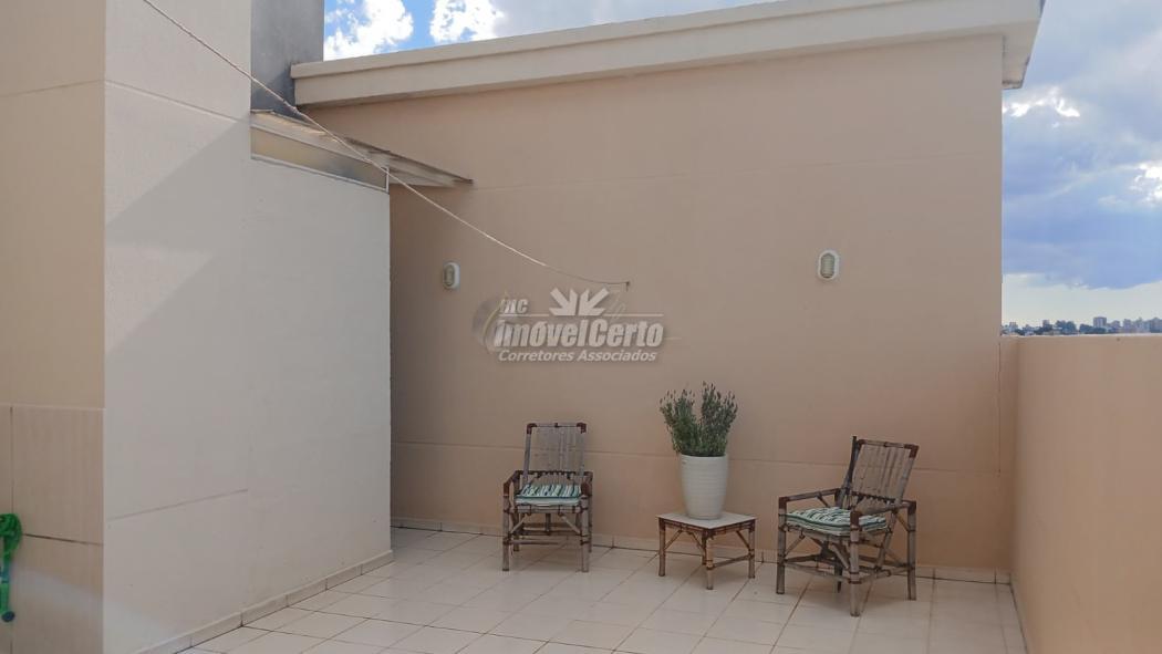 Apartamento com dois pavimentos, sendo o inferior apartamento tipo e o superior um terraço com ático, lavabo e área de serviço coberta.