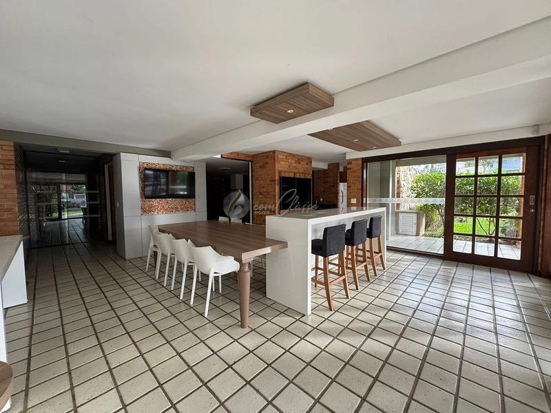 Na área social, a integração entre cozinha, sala de jantar e espaço gourmet com churrasqueira cria um ambiente moderno, funcional e acolhedor. O living amplo, ideal para estar ou home theater, também possui infraestrutura para ar-condicionado.