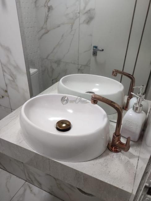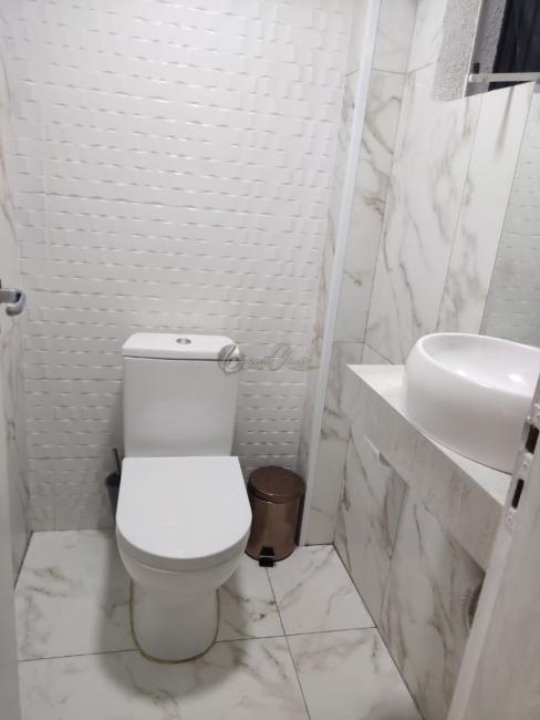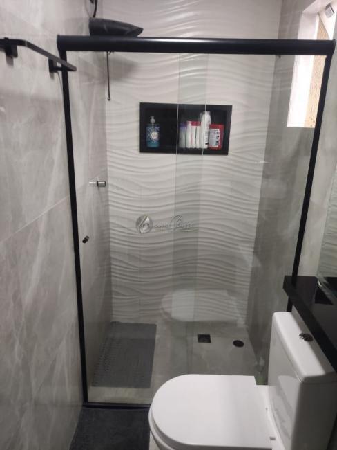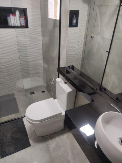 - Banheiro com porcelanato até o teto e box de vidro e bancada.