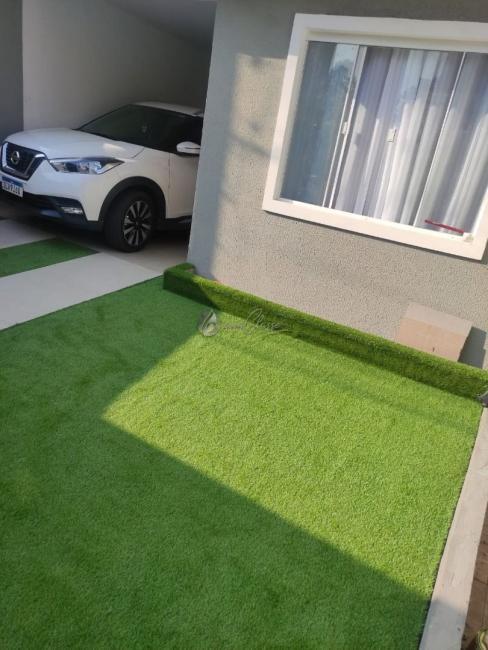 Conta também com um muro de vidro trazendo uma elegância ao sobrado e o jardim com grama sintética.